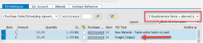 A entrada da fatura não está conforme o pedido. Quando se utiliza chave de custo de frete no pedido, está sendo informado que o processo tem frete e que o mesmo é conhecido/planejado.